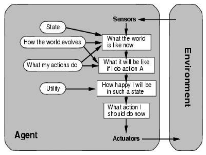 uses world model + utility function that measures preferences among states