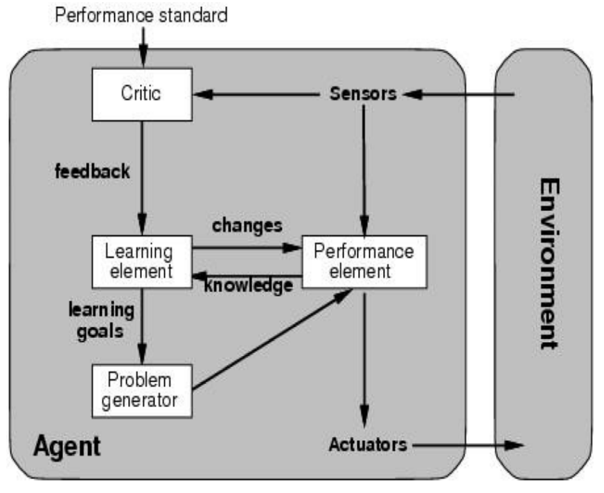 - learning element: improves performance element, critic gives feedback