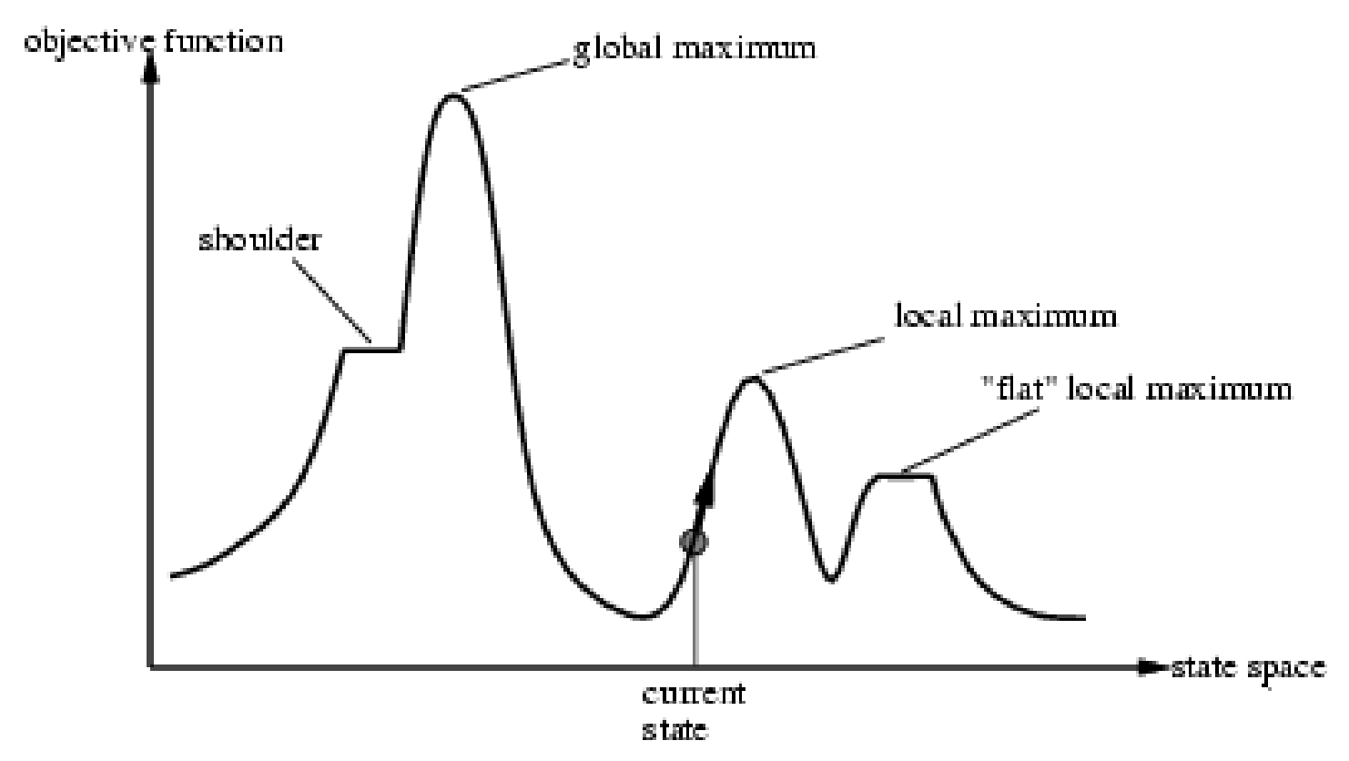 graph TD Start[Initial state] --> A[Neighbor 1] Start --> B[Neighbor 2] A --> Peak1[Local maximum] B --> Peak2[Goal or Local max]