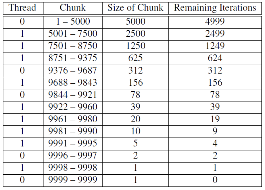 - dynamic: when a thread finishes a chunk, it requests another one from the run time system
